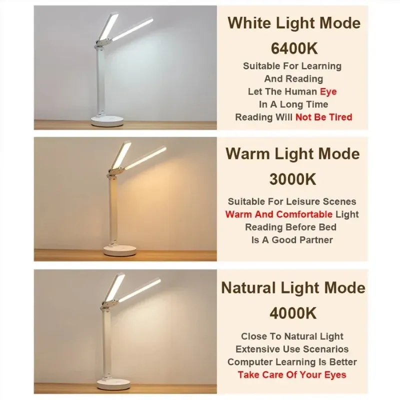 Nom du produit: lampe de bureau tactile LED Batterie: batterie au lithium Produit Couleur: Blanc Couleurs claires: Nature/blanc chaud/chaud Tension: 5V اسم المنتج: مصباح مكتبي LED يعمل باللمس البطارية: بطارية ليثيوم لون المنتج: أبيض الألوان الفاتحة: طبيعة/أبيض دافئ/دافئ الجهد: 5 فولت